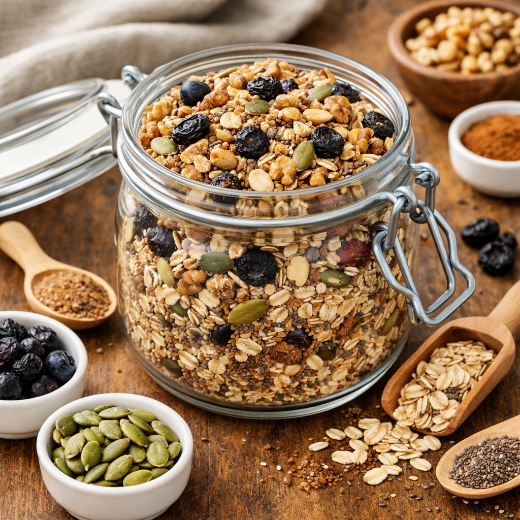 This brain-healthy muesli is designed as a shelf-stable, make-ahead option that supports cognitive health with whole grains, anti-inflammatory fats, and polyphenol-rich ingredients. Rooted in MIND, Mediterranean, and Nordic dietary patterns, it focuses on dry, stable components that support blood sugar regulation, vascular brain health, and gut–brain signaling—making it ideal for batch preparation and easy daily use.