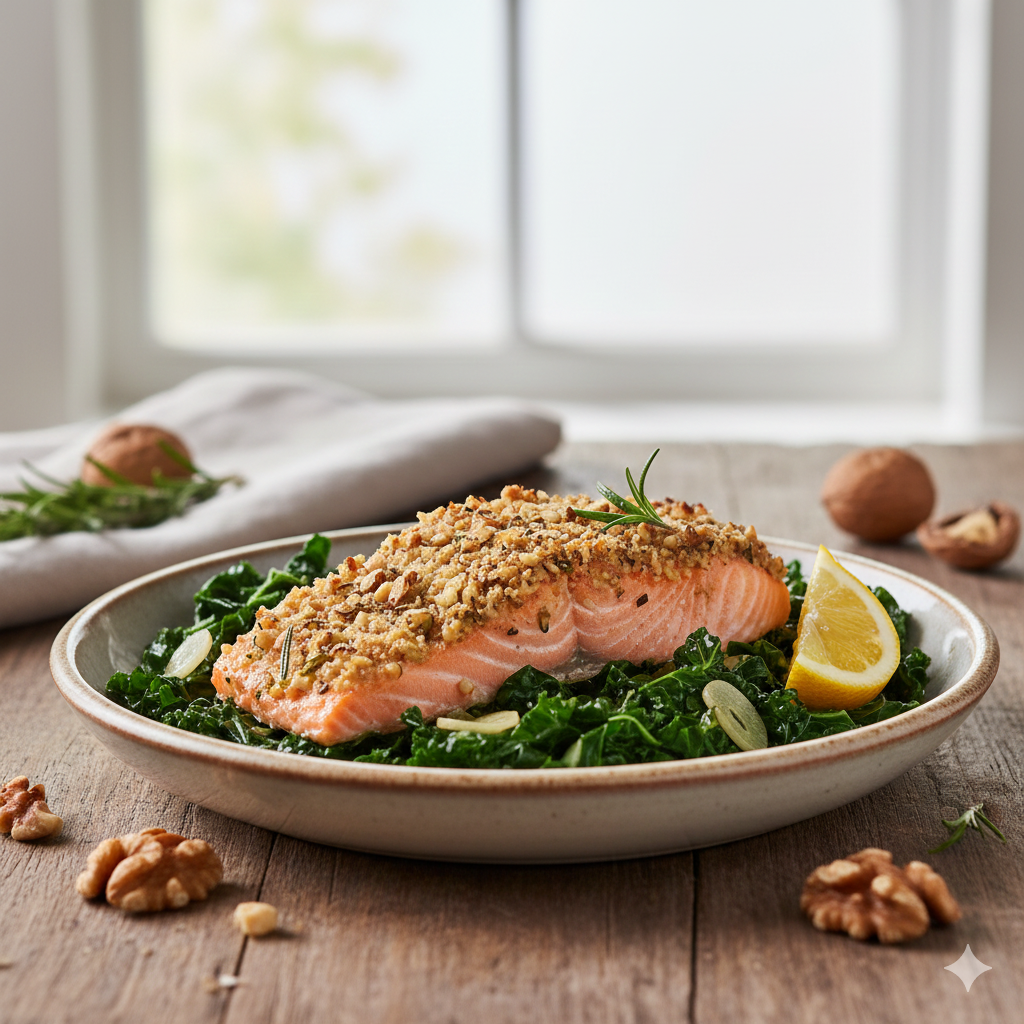 This Walnut-Crusted Salmon with Garlicky Kale is the ultimate MIND diet recipe designed to support peak cognitive function and long-term brain health through a powerhouse of specific nutrients. By combining wild-caught salmon—the gold standard for neuroprotective foods due to its rich supply of Omega-3 fatty acids (DHA/EPA)—with a crunchy walnut crust, you are providing your body with the Alpha-Linolenic Acid (ALA) and Vitamin E essential for maintaining brain cell integrity and memory. This gluten-free and anti-inflammatory meal replaces traditional breadcrumbs with finely chopped walnuts and aromatic rosemary, which is loaded with carnosic acid to fight neurodegeneration. Served over a generous bed of garlicky kale, this dish delivers a massive dose of Vitamin K, lutein, and folate—nutrients clinically proven to slow cognitive decline. Every bite of this Mediterranean-inspired dinner is crafted to follow MIND diet guidelines, offering a delicious way to fuel your brain with the antioxidants and healthy fats it needs to thrive.